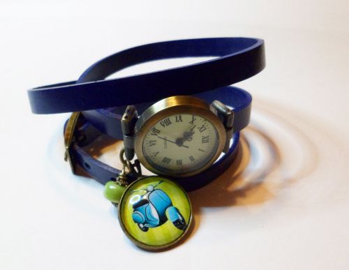 Montre braceleten cuir bleu 3 tours de poignet décoré d'un beau cabochon loupe "Vespa bleu" sur fond anis
